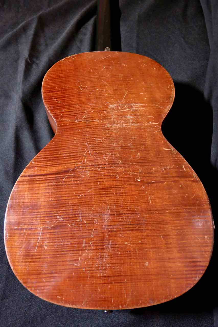 This parlour guitar from late 1800, early 1900, features all the extras to make it look great, flamed wood, elaborated rosette with inlays, Smiley bridge, …