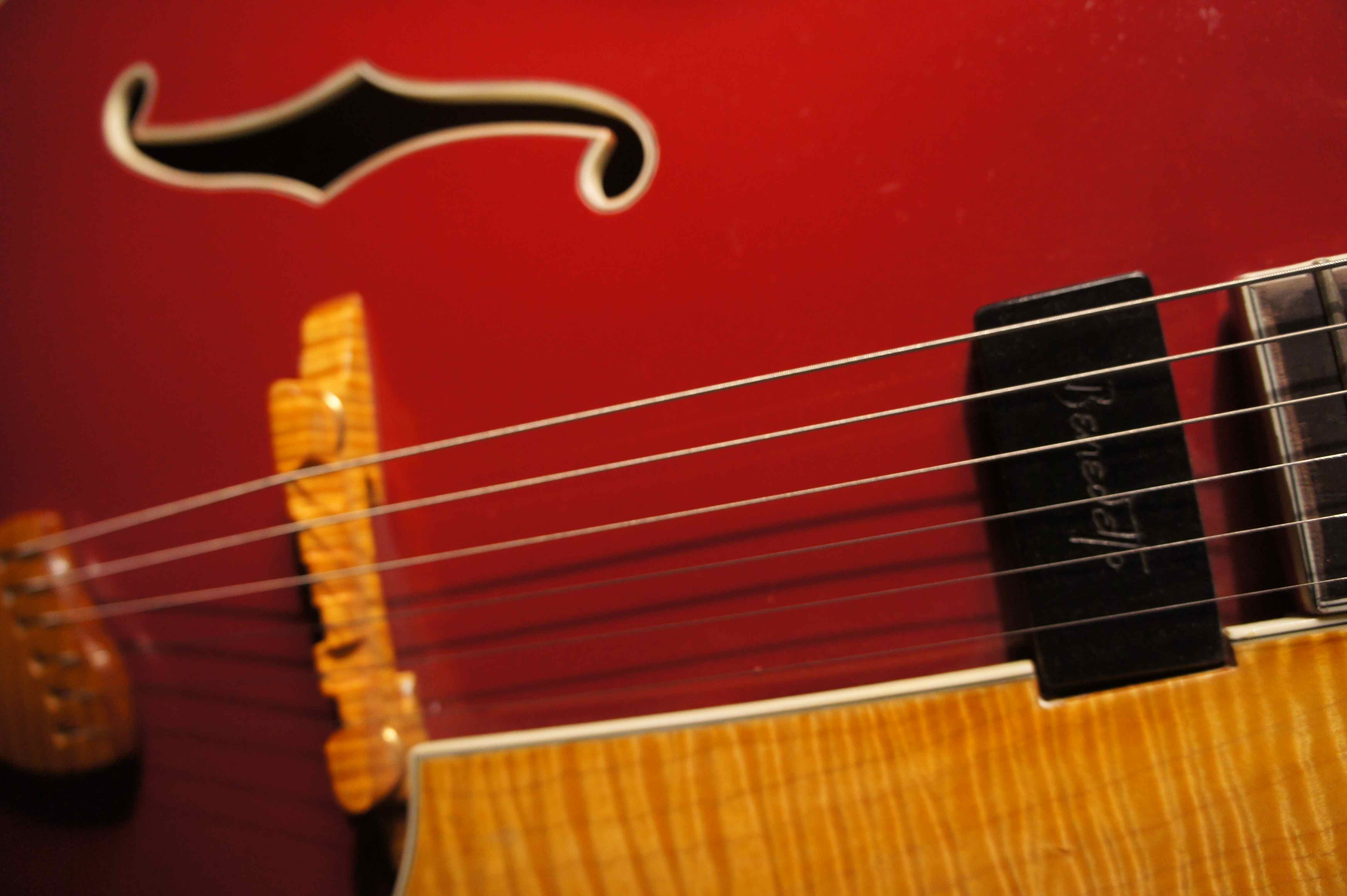 This is a lovely carved-top, custom-made archtop made for Arlen Roth. The guitar has single Benedetto pickup, hidden volume and tone controls, lovely accents in flame maple and deluxe abalone. Great Jazz tone! Furthermore it has bound ebony fingerboard, gorgeous dark red color.