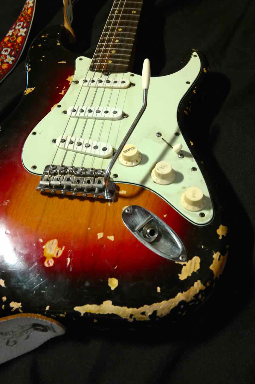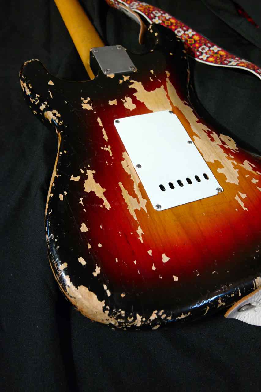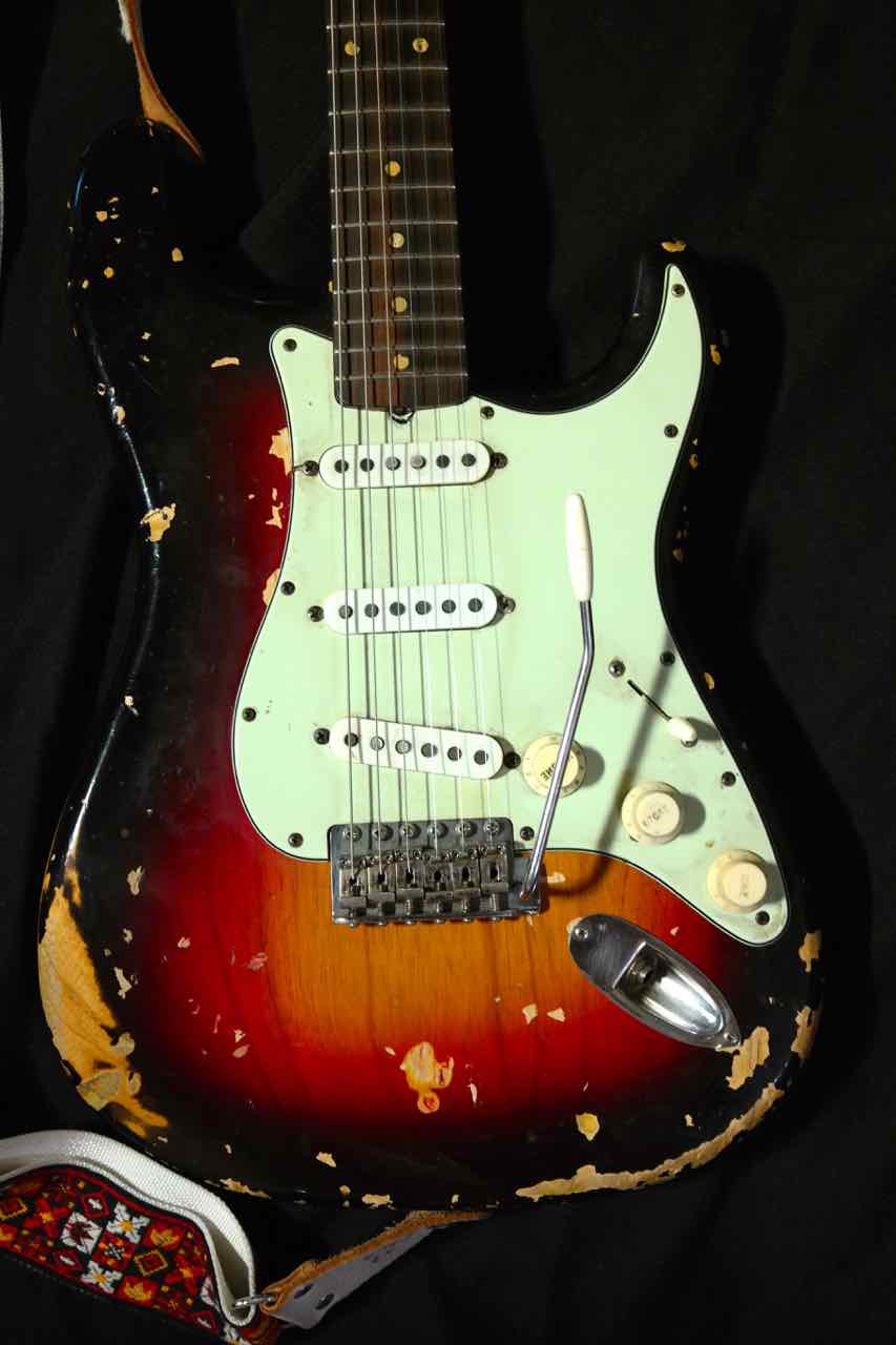 The Fender Stratocaster guitar is probably the most popular solid-body electric guitar ever made. Early models (1954 to 1965, known as "pre-CBS" models, since CBS Broadcaster Company bought Fender in January 1965) are the most collectible and sought-after instruments. The 1961 Stratocaster was not radically different from those of '59 and '60. The neck profile did thicken somewhat, though was not as thick as pre-1958. Other changes include the addition of patent numbers to the headstock, and a bolder red hue in the "3-tone" sunburst finish. The wood composition remained alder body featuring the three-ply white-black-white celluloid nitrate pick-guard, maple neck with "slab" rosewood fingerboard. Sunburst was a standard finish for the '61 Stratocaster though some custom finishes do start to become more common.