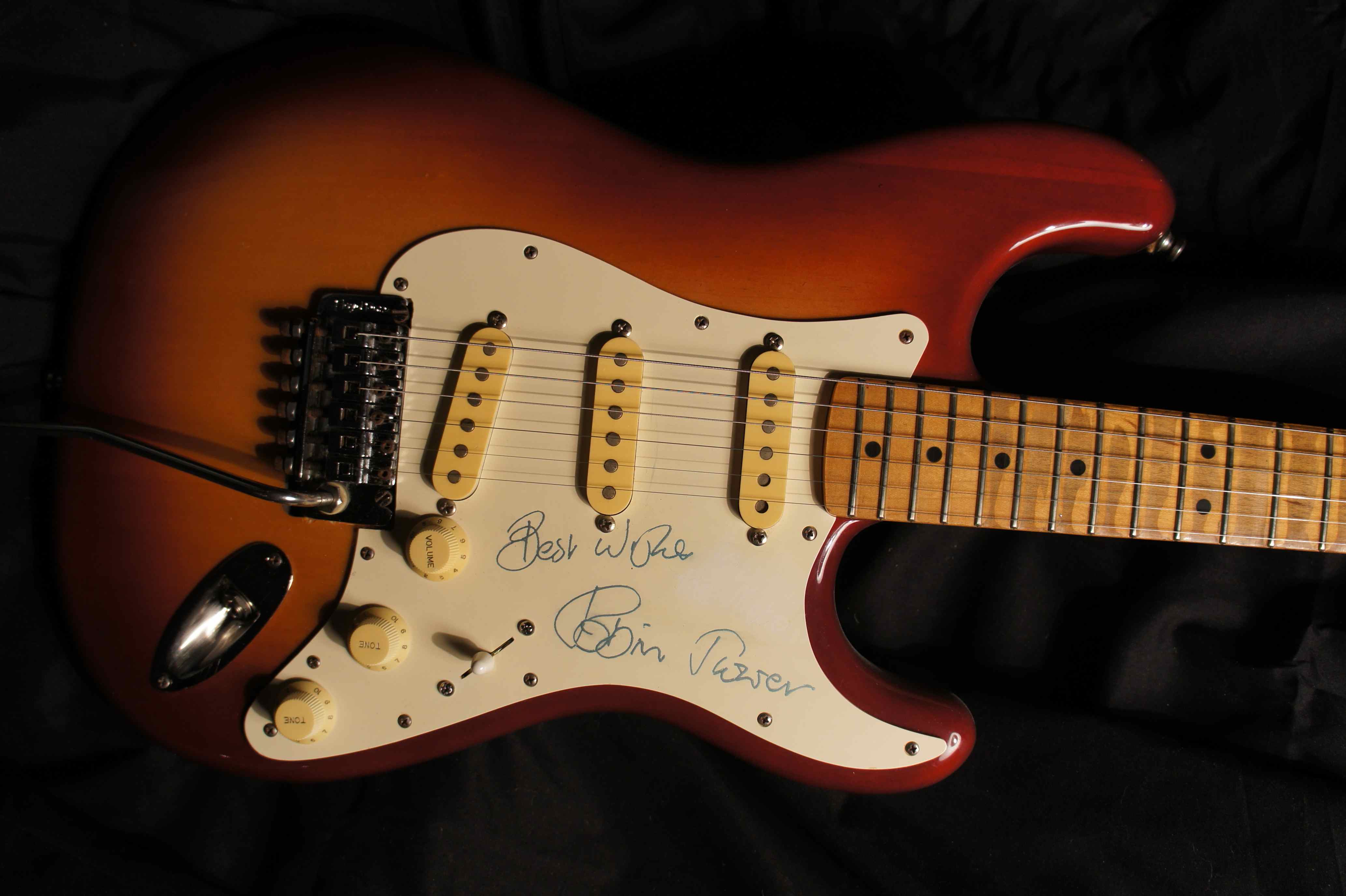 This is a Fender Stratocaster guitar which has been signed by Robin Trower, who is supposed to have owned this guitar before he donated it for a 'Hard Rock Cafe' project which didn't materialize.