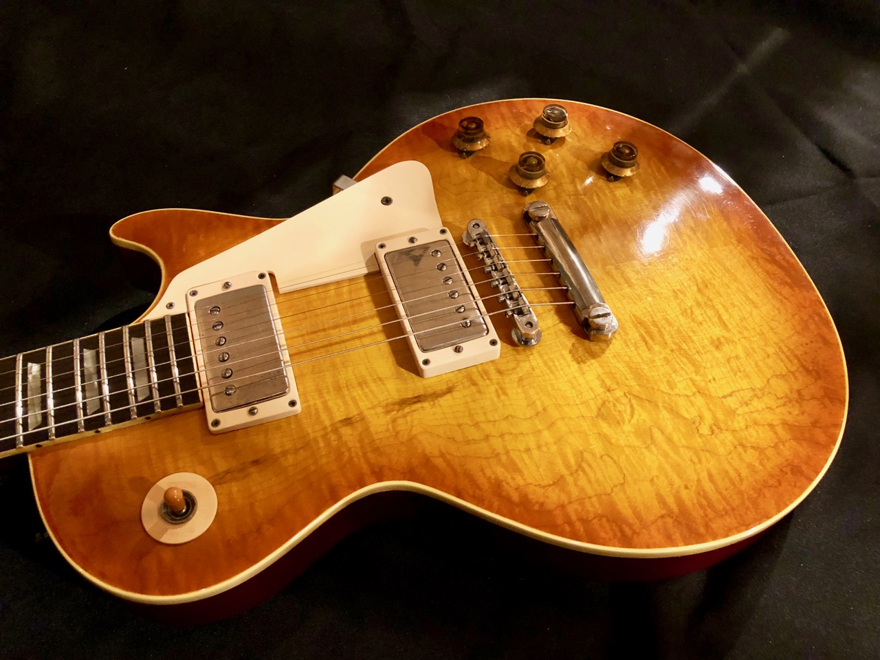 The guitar started out life as a gold-top back in 1954, the guitar was converted to 1959 Les Paul Sunburst specifications sometime in the 1970's.