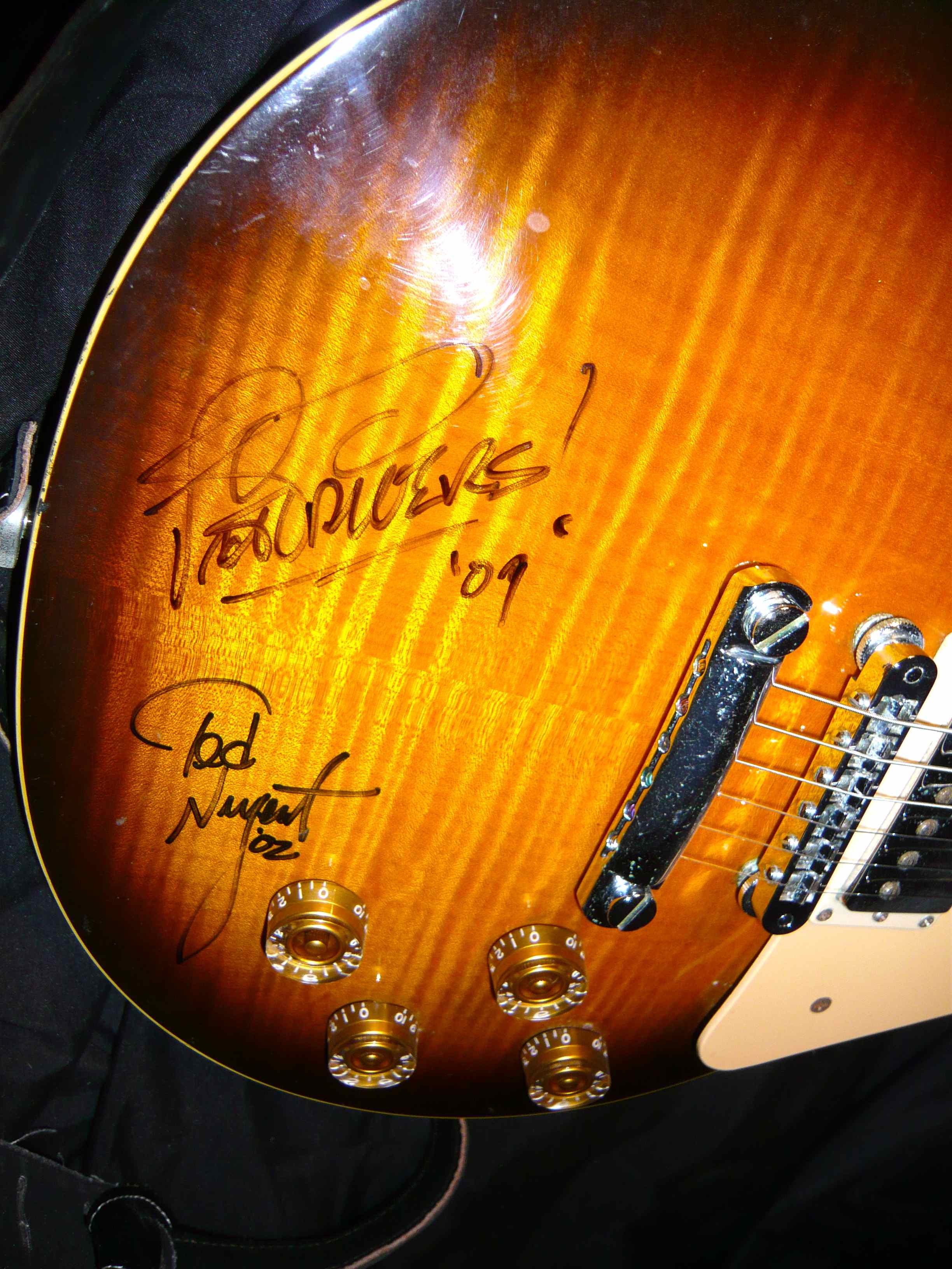 This Gibson Les Paul Standard owned by Pat Travers has a long an interesting story. Named Black Beauty, this guitar was stolen from the concert stage at a Pat Travers show. In this adventure the neck was brocken and had to be repaired by Gibson. After that Pat Travers did no longer take this beauty out for concerts. He recorded the album Pat Travers: P.T. Power Trio in 2003 with this guitar. Otherwise it hung during years in his bedroom on the wall. Out of admiration Pat had this guitar signed by Ted Nugent. The guitar is shown in multiple promotional shots.