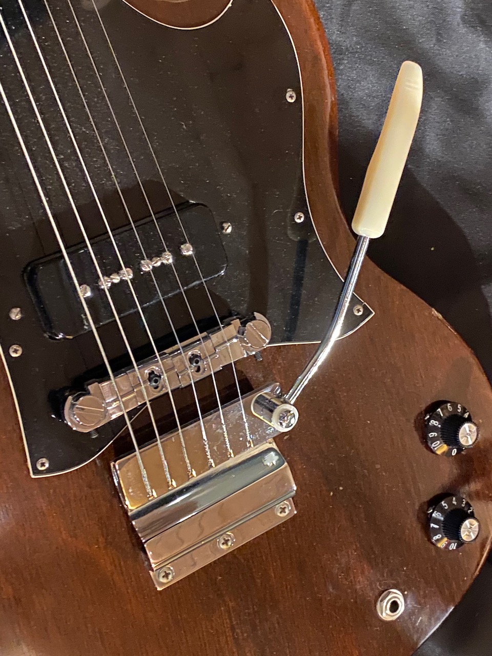 The Gibson SG Junior is a solid-bodied electric guitar manufactured by Gibson from the early 1960s to the early 1970s. Like its earlier sister, the Gibson Les Paul Junior, it had been created for sale at a lower price. It is known for its single P-90 treble pickup, and the single piece 'wrap-around' bridge instead of the two-piece “tune-o-matic” bridge and tails-stop arrangement found on the SG Standard. From 1961 to 1963, it was branded with the "Les Paul Junior" name. In 1963, "Les Paul" was removed from the headstock and it was officially called the SG Junior. From 1966 to 1971, it had a generic SG pickguard with a soapbar P90 rather than the original dog-ear. It was discontinued in 1971. The late 1960s version was re-issued by Gibson between 1999 and 2001. Between 2011 and 2015 Gibson rereleased a Junior which more closely resembled its early 1960s incarnation.