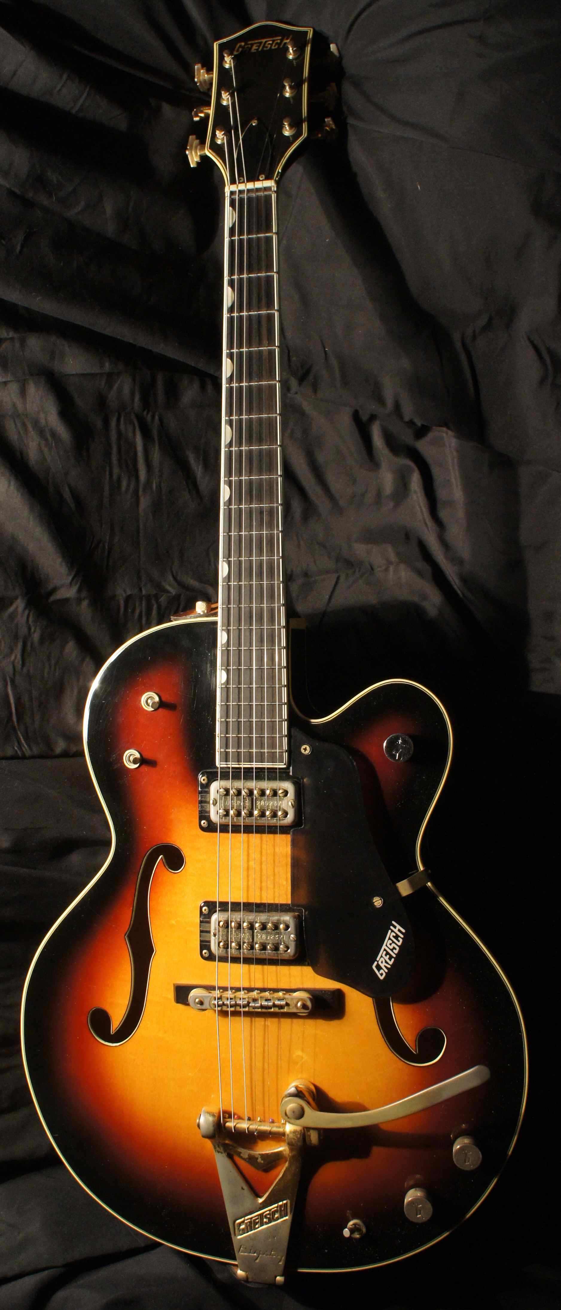 Among Gretsch’s first commercially successful electrics, the Country Clubs were directly descended from the 6030 and 6031 of the Synchromatic line, which were in turn directly descended from the pre-war “cat-eye” Synchromatic 300.