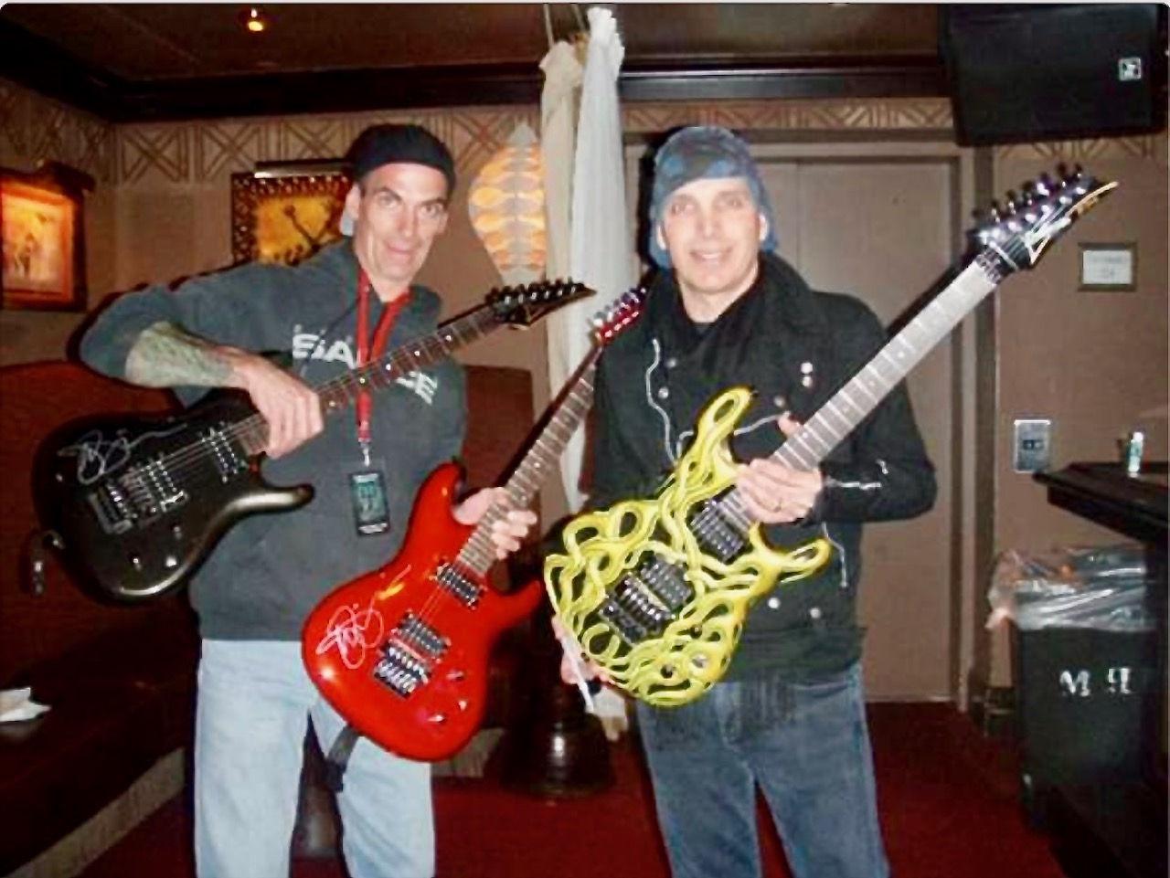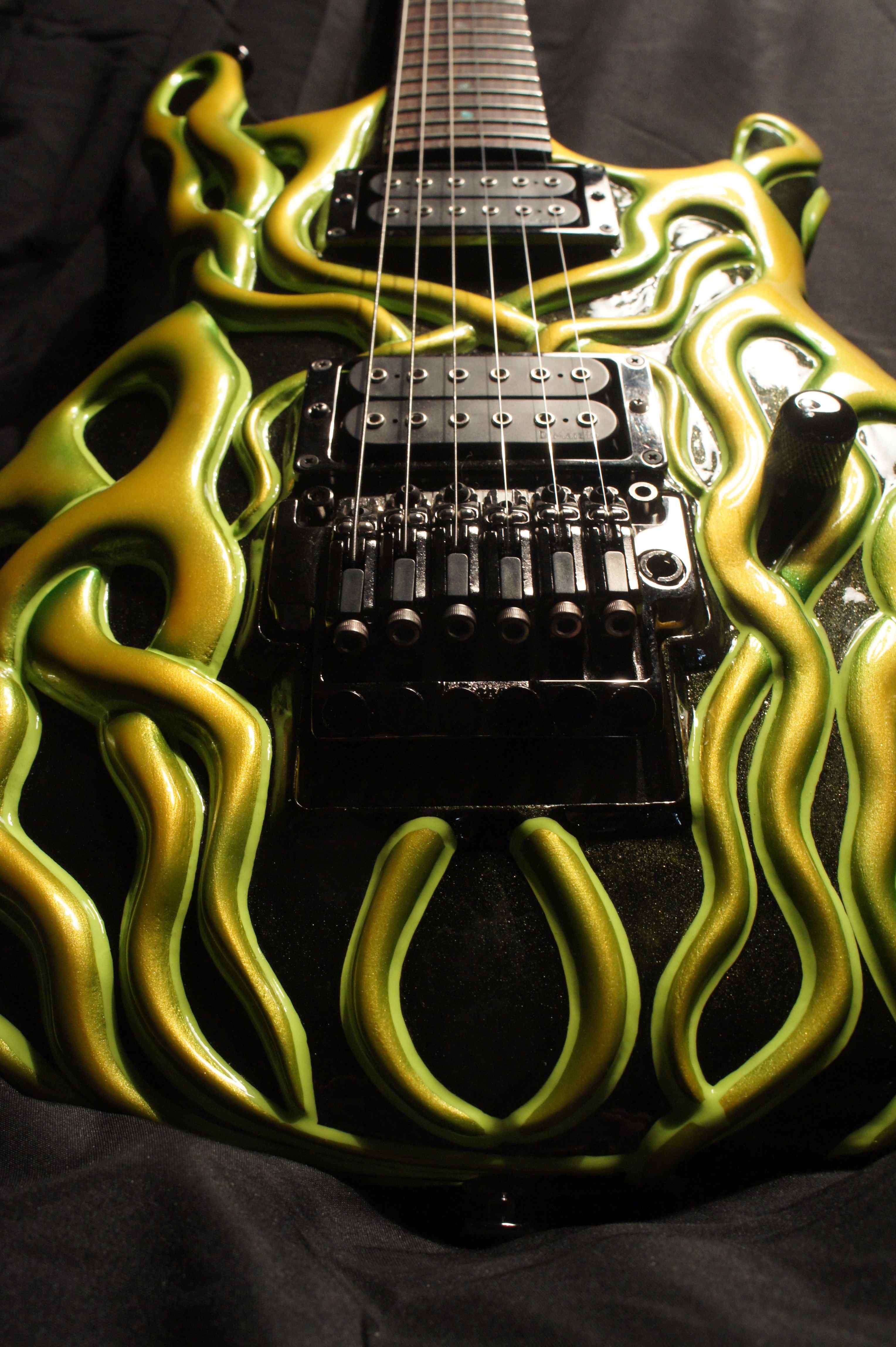 This one-off guitar has been designed and completely hand carved by Troy Bianco and presented personaly to Joe Satriani at the House of Blues located in Las Vegas and was baptised 'Green Eel'. It was signed at that occasion by Joe Satriani.