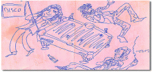 Whimsical sketch by John Lennon from 1974 depicting himself with Harry Nilsson and Jesse Ed Davis [Lennon's guitarist] standing around the pool table at Rodney Bingenheimer's English Disco in LA.
