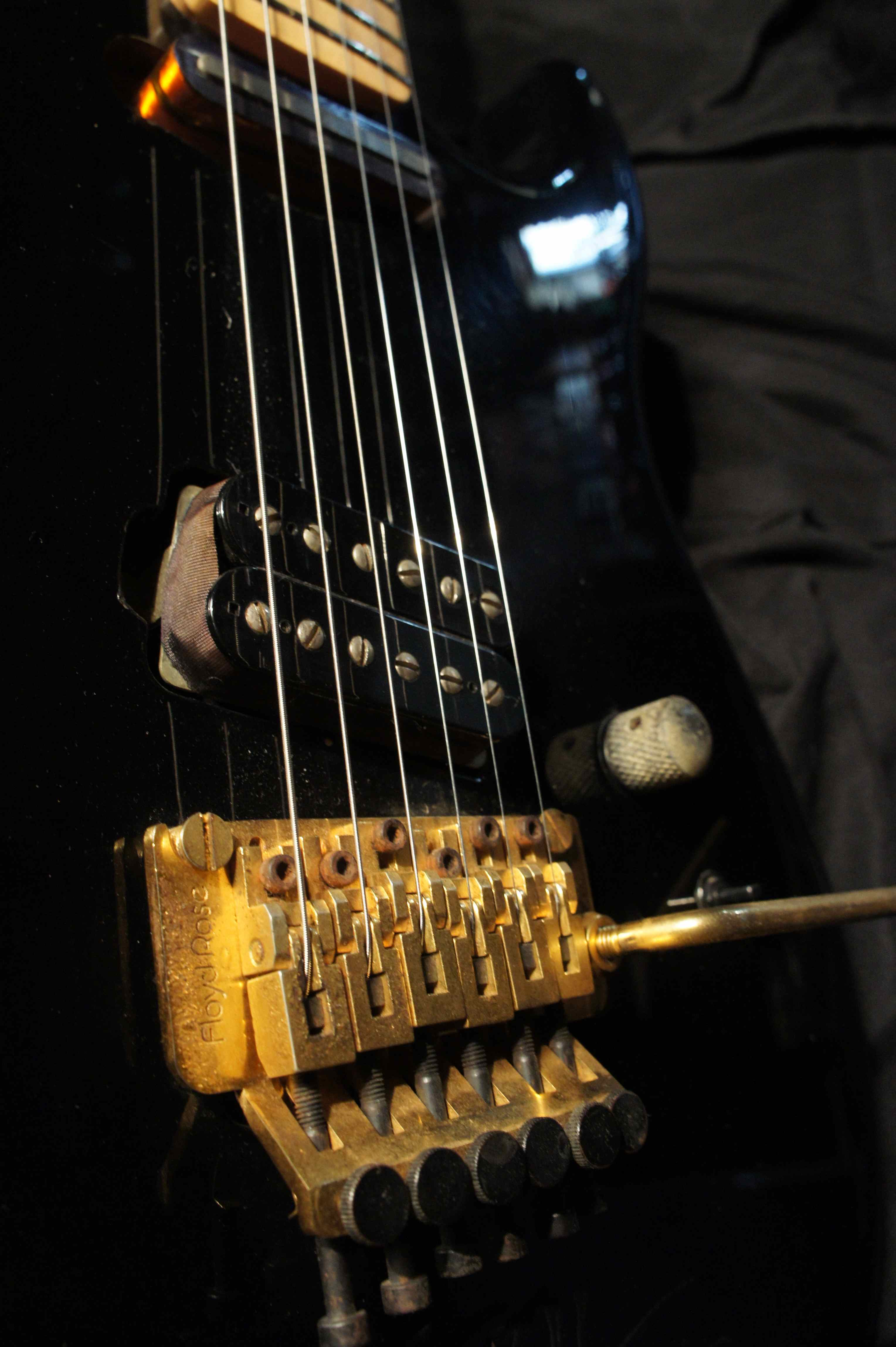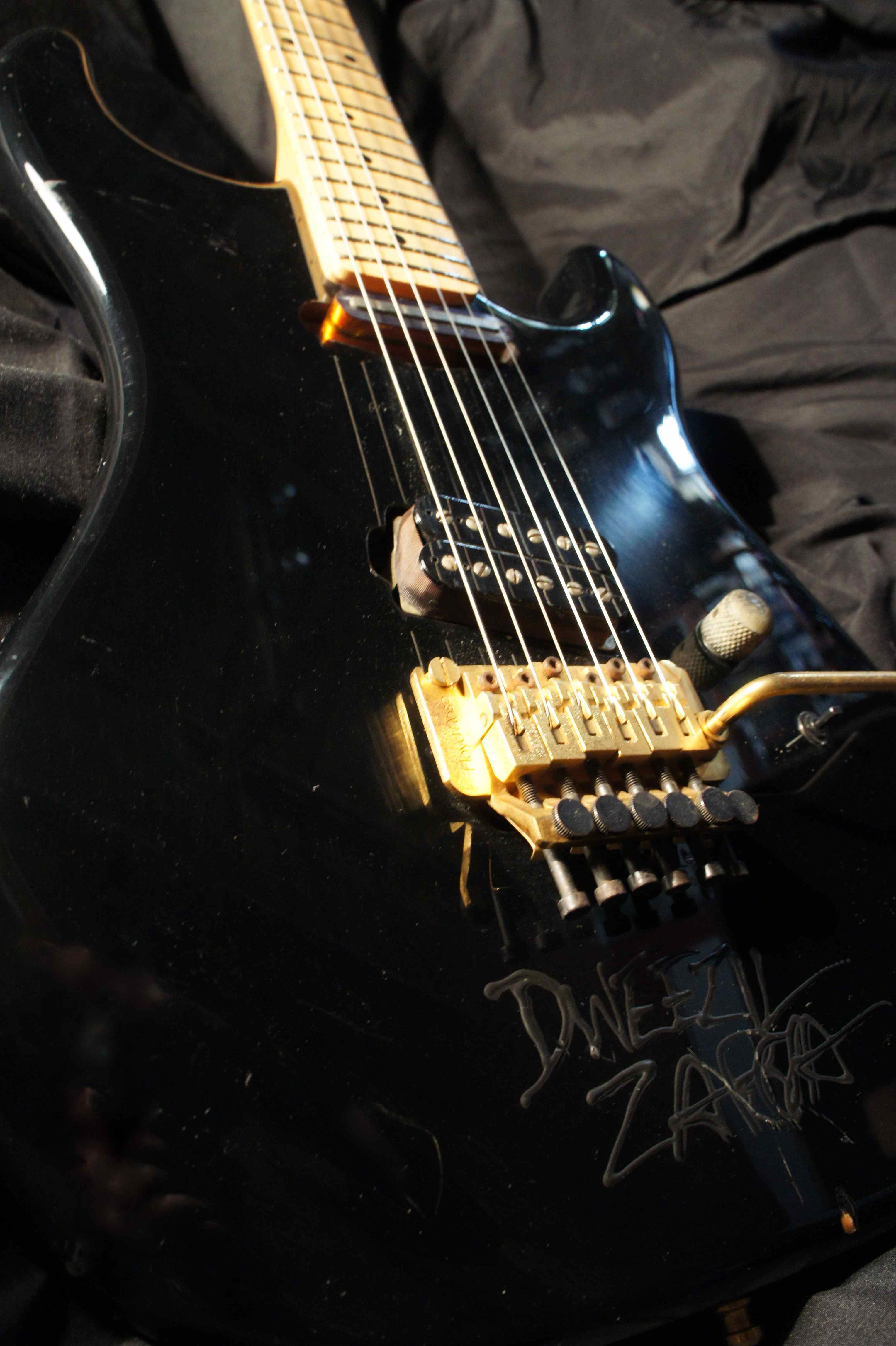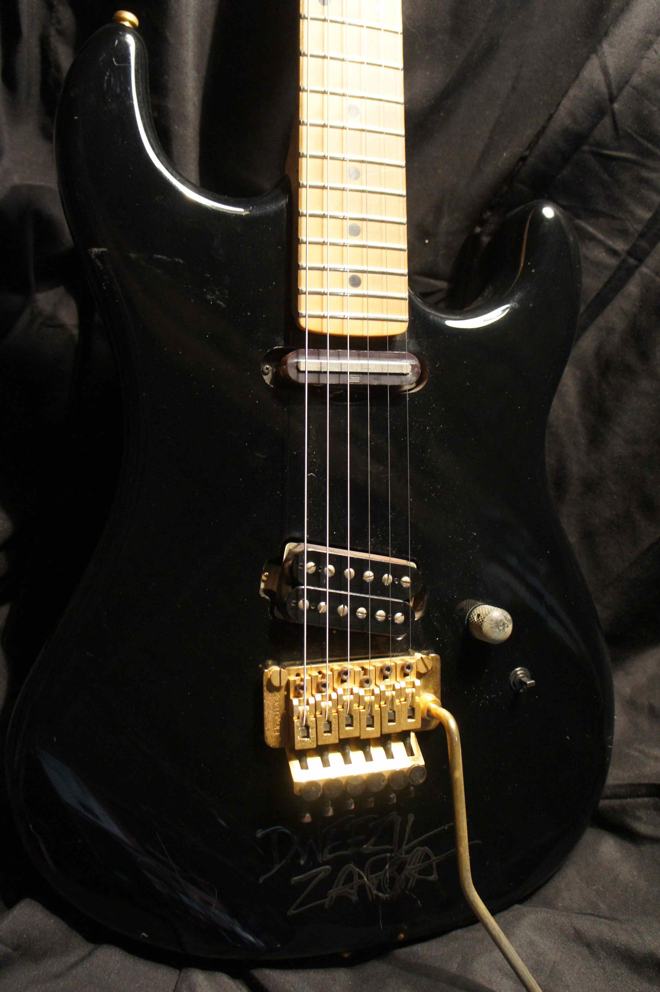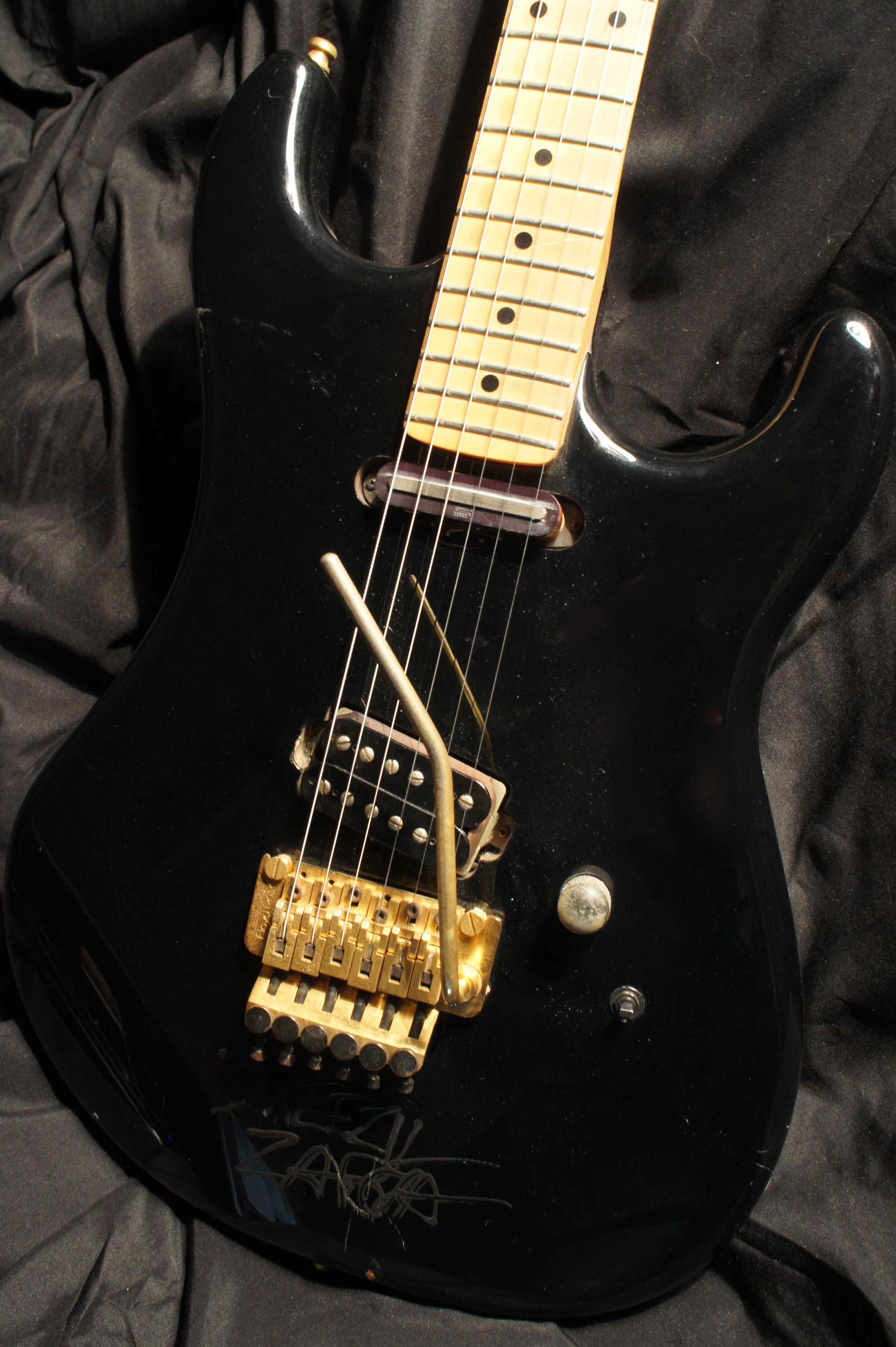 This guitar has a second pickup at the neck position and several other custom changes to the normal configuration. This guitar which has been signed by Dweezil Zappa, who is supposed to have owned this guitar before he donated it for a 'Hard Rock Cafe' project which didn't materialize.