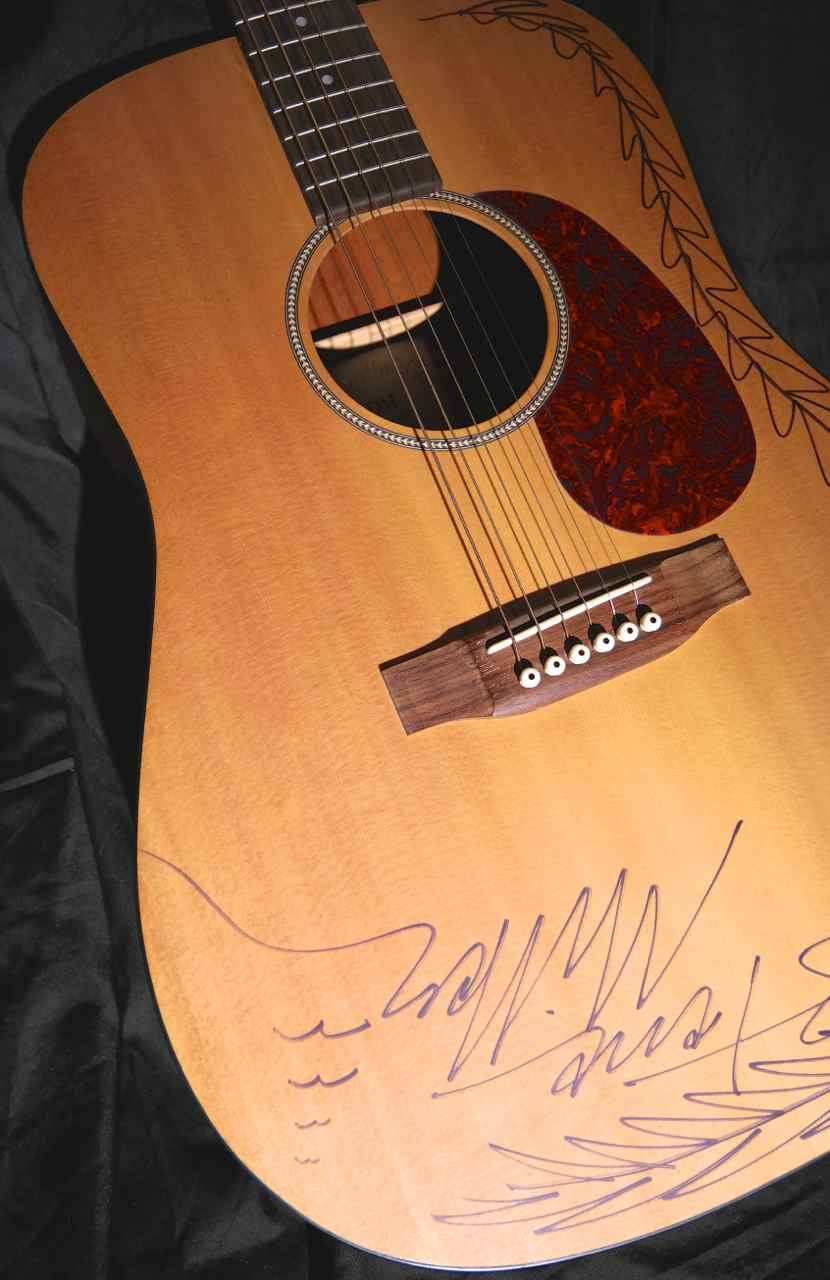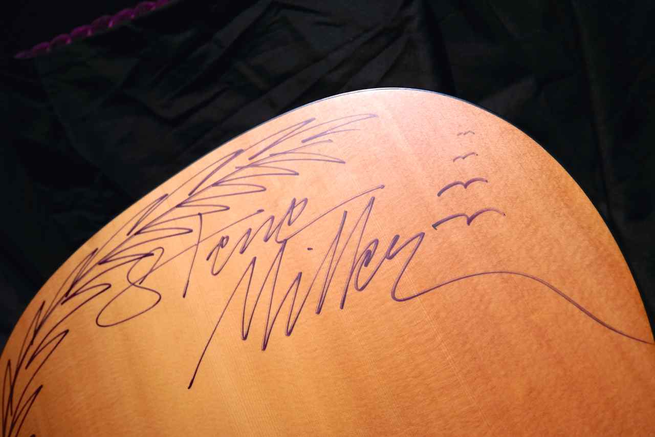 This Martin DM Dreadnought Mahogany acoustic guitar was signed by Steve Miller. The DM features laminated genuine mahogany back and sides with a solid spruce top, single band herringbone rosette, and a durable satin finish. One of Martin's Road Series models, the Martin DM Dreadnought Acoustic Guitar delivers all the full, rich tone that has made the Martin name famous.