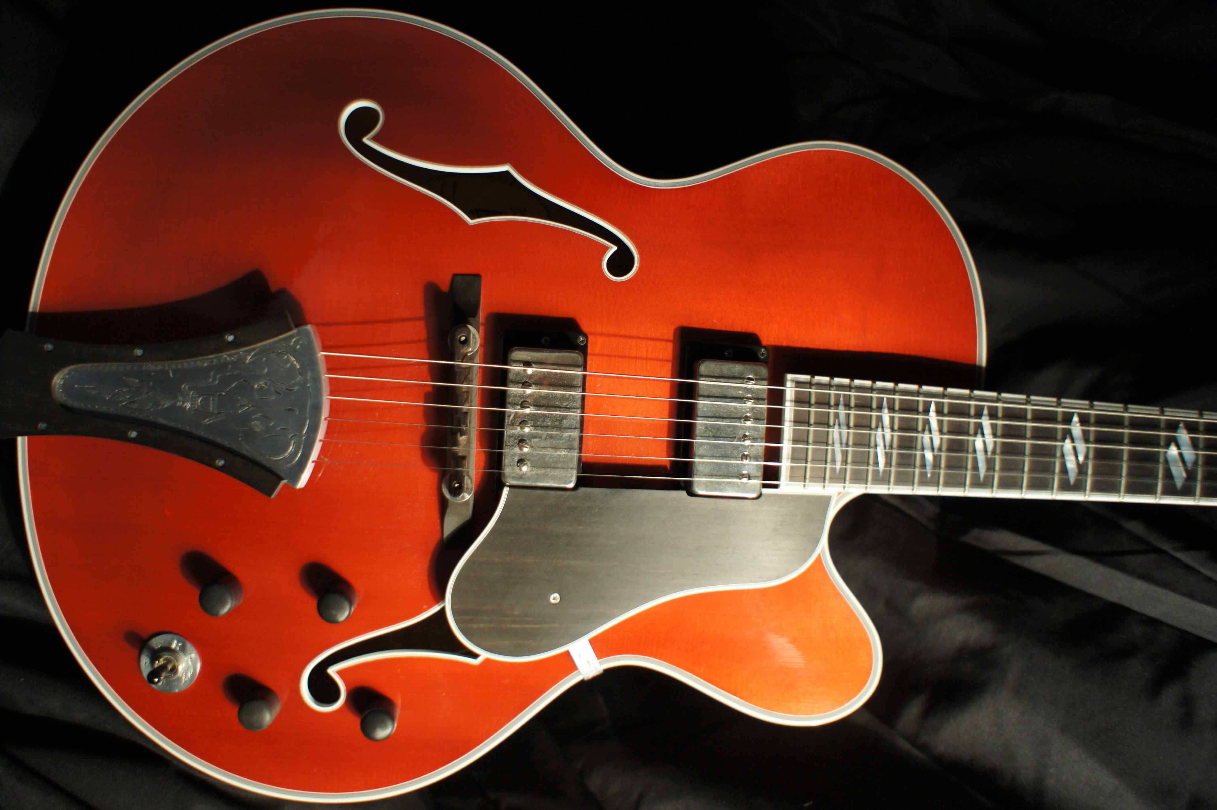 The Foyers electric archtop guitars are beauties, featuring engraved metal pieces by Danny O'Brien. The red one was featured in the catalogue presenting the new range of PATRICK JAMES EGGLE guitars.