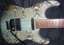 This very rare blue color boa constrictor snakeskin guitar was custom build for Warren DeMartini, who used it during concerts. The snakeskin is applied in a special way only Performance Guitar can realize. A beautiful beast!