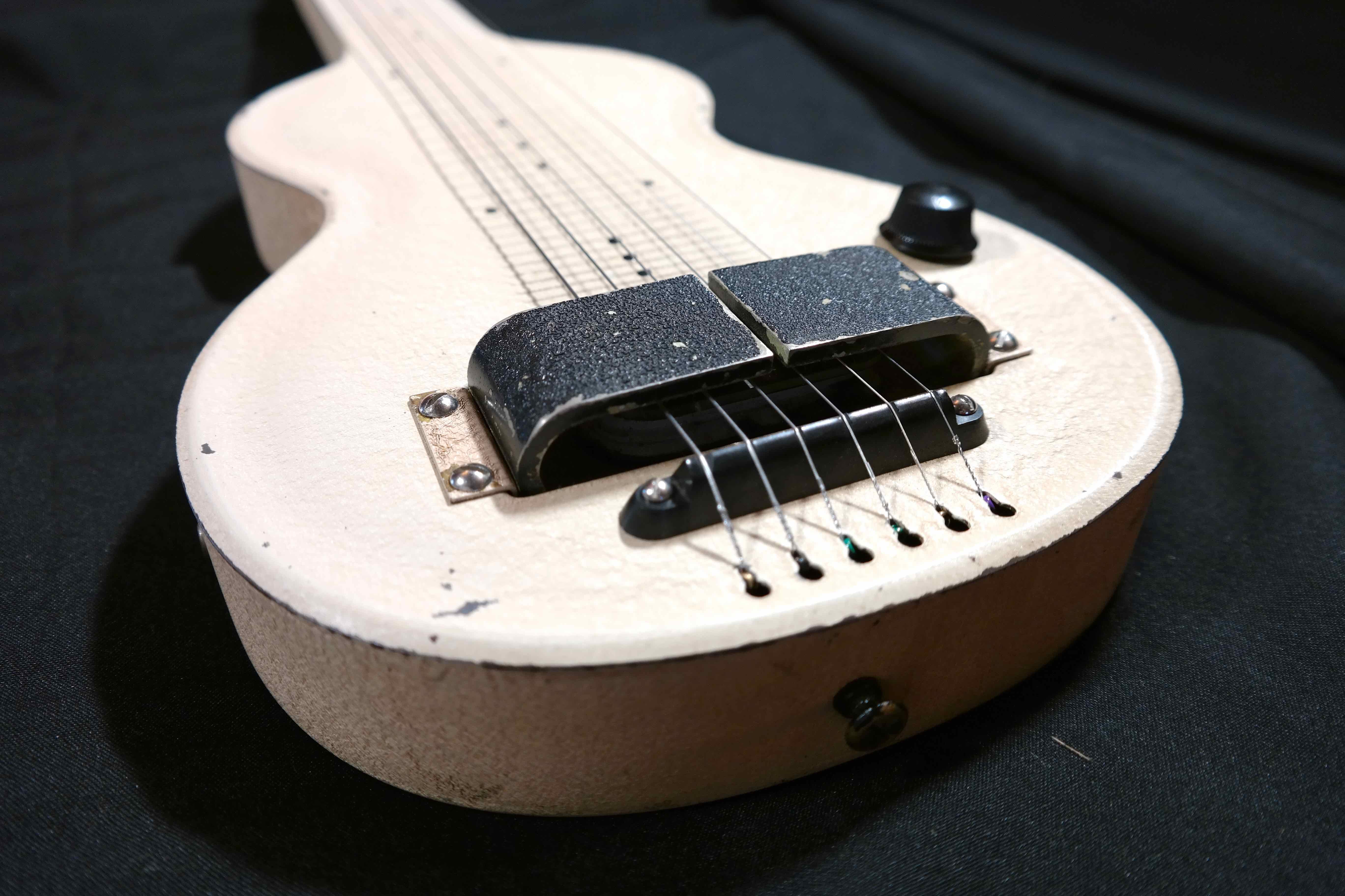 In the late ‘30s the 59 was Rickenbackers entry-level lap steel but the feel of this instrument isn't flimsy or cheap at all. These lap steels were stamped out of sheet metal but look rather luxurious with a finely textured lace-like enamel finish.