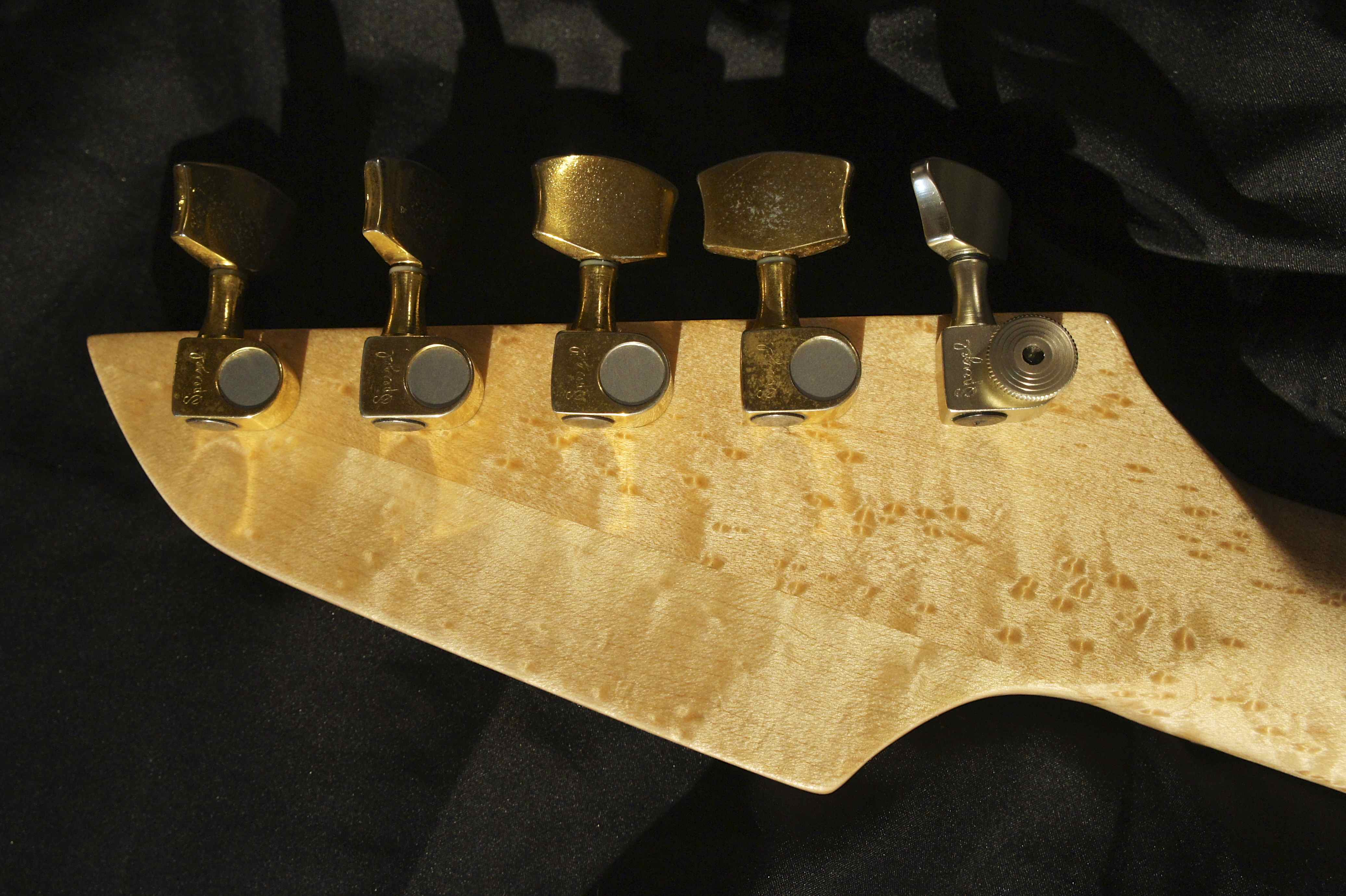 It was very heavy with the body being of solid purple heart so I had another luthier...Newman Remzel (coincidence) chamber it , refinish it & build a new neck. The top & neck are outrageous birds-eye maple. I doubt if you can find a prettier piece. We looked thru tons & we couldn't. Weight is 9.8lbs, 34" scale, passive Bartolini PJ pickups. Gotoh bridge, Sperzel tuners. Controls are Vol/vol/tone. Just refinished so there are no dings. It's a wee bit neck heavy so I was thinking of adding an active preamp but haven't gotten to it. It's a beautiful bass and a great player.....one of a kind.