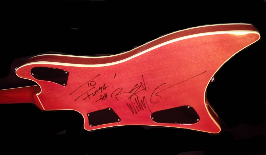 The Flash II was hand-made in 1981 by Tom Holmes as designed by Billy Gibbons of ZZ TOP. Billy signed the guitar and drew the art before the guitar was sprayed with its final finish coat therefore it is protected. It reads "To Flash from Rev. Willie G.". Furthermore the head has a mother of pearl inlaid-"FLASH CADILLAC II".