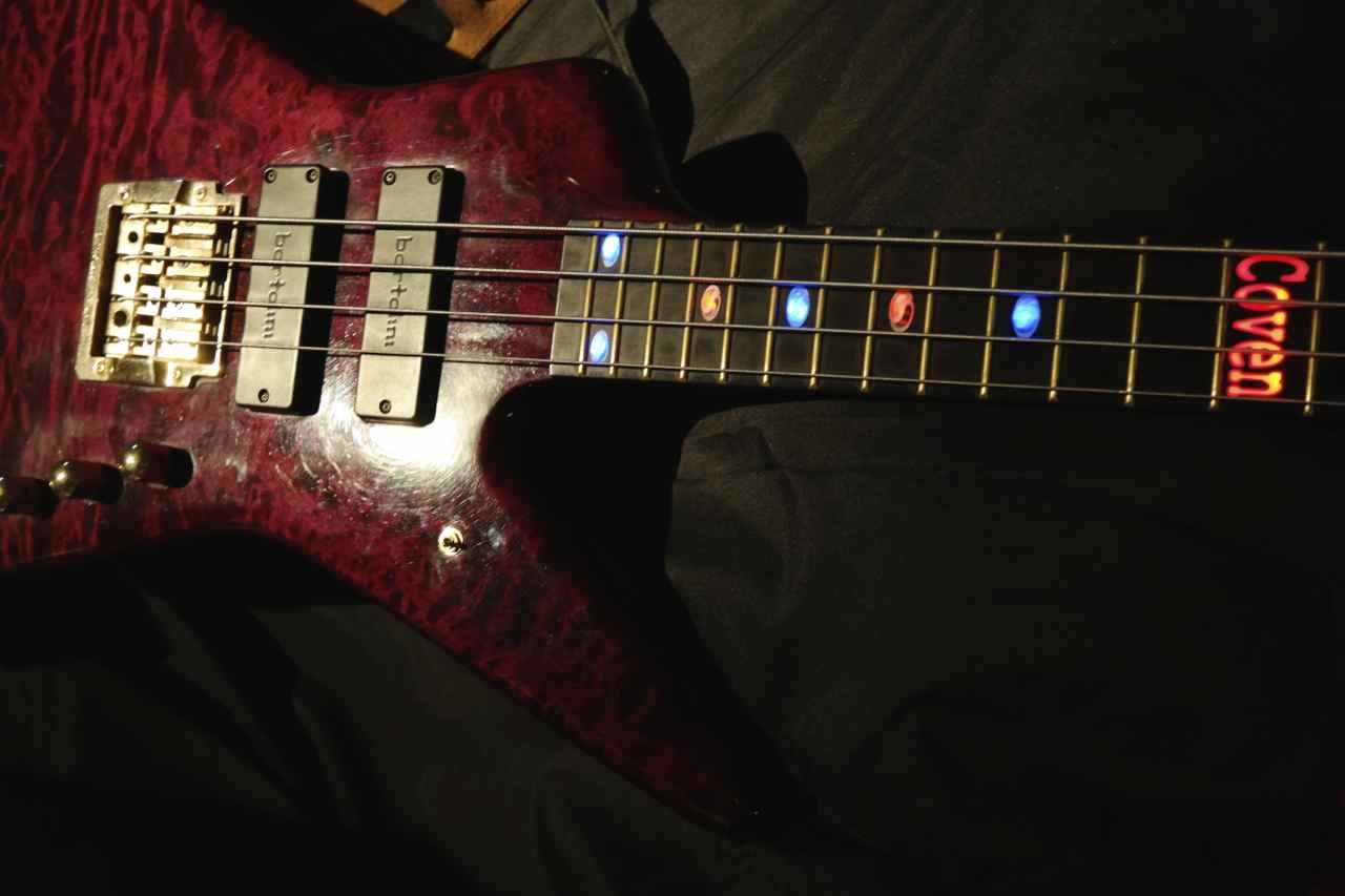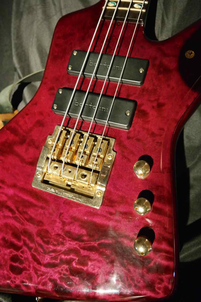 This is a custom made 34" long scale, one of a kind, Warwick Stryker bass guitar. It has a mahogany hollow body (Tone Chamber System - TCS), AAA-Quilted Maple top with French Violet Stain High polish. The neck wood is flamed maple and has a custom inlays front LEDs fretboard with a Tigerstripe Ebony fingerboard. Pick-ups are Bartolini CU PU with passive electronics. It has gold hardware with Kahler vibrato, Warwick machine heads with D-tuner.