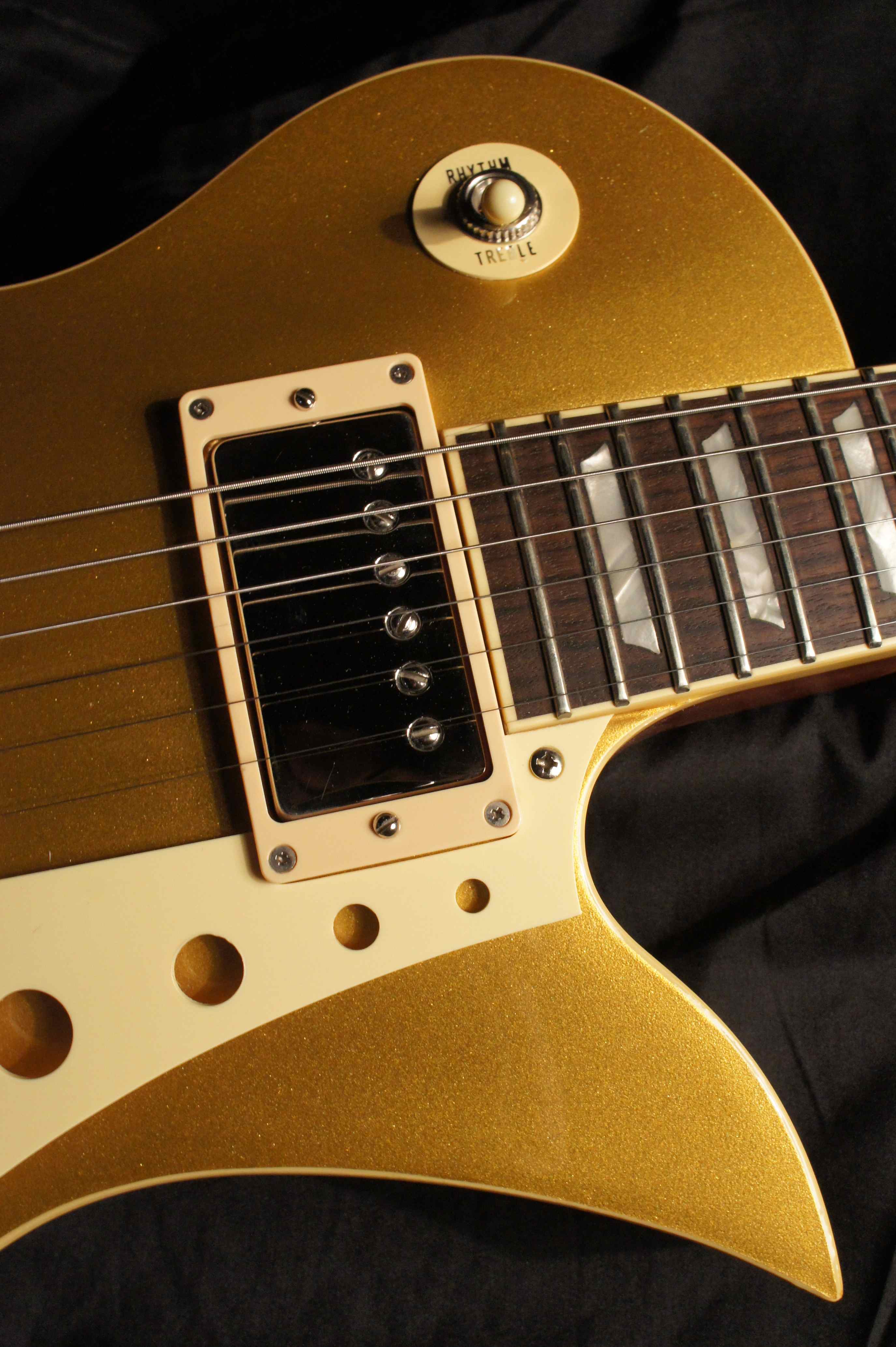 Gold Top was the only finish available. The Rubber Jig sports 2 Seymour Duncan pickups, ‘59 at neck and JB at bridge. There’s also only one volume knob and a three way switch. The Bridge is a Gibson Nashville bridge clone in inch measurements, and that is surprising, because most of Asia made guitars use metric parts.